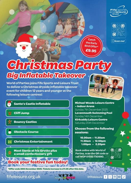 Kirkcaldy's Christmas Party brings festive fun for the whole family. Join us at Kirkcaldy Leisure Centre for bouncy castles, inflatables, games and a visit to Santa's grotto. Every child receives a confectionary gift. Fast-paced, safe and full of joy — perfect for little ones and parents who want an easy, magical daytime event. 🎅🎁